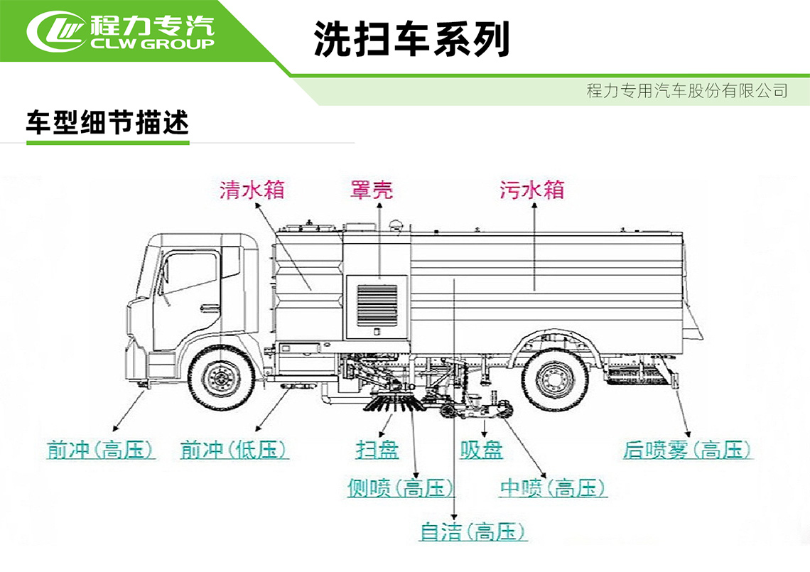 洗掃車集掃路車、灑水車和高壓清洗車功能于一體,具備路面清掃、路面洗刷、高壓清洗、低壓沖洗、路緣石洗刷、垃圾收集、污水回收、噴霧降塵和道路隔離墻清洗、小廣告清洗等多種作業功能。