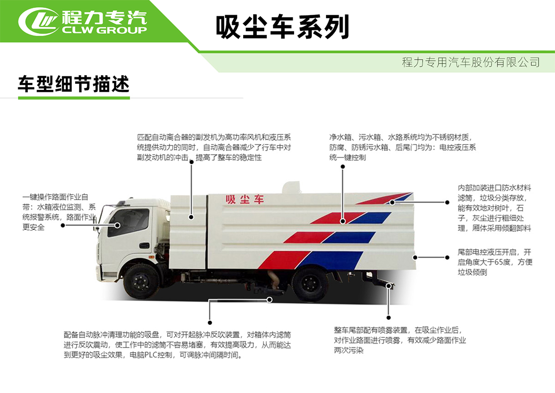 東風小多利卡5方吸塵車專用配置:塵箱:4立方米,水箱:1立方米;中置吸盤、江鈴五十鈴副發動機、施耐德控制開關、海普瑞斯電磁閥組、無級變速自動離合器、免維護離心式風機、高精度垃圾箱過濾系統(最高可達0.5微米),不銹鋼垃圾箱、進口脈沖閥、垃圾箱舉升自卸、尾部LED箭頭燈、車尾霧狀噴水潤濕功能、倒車影像、手動泵應急系統。